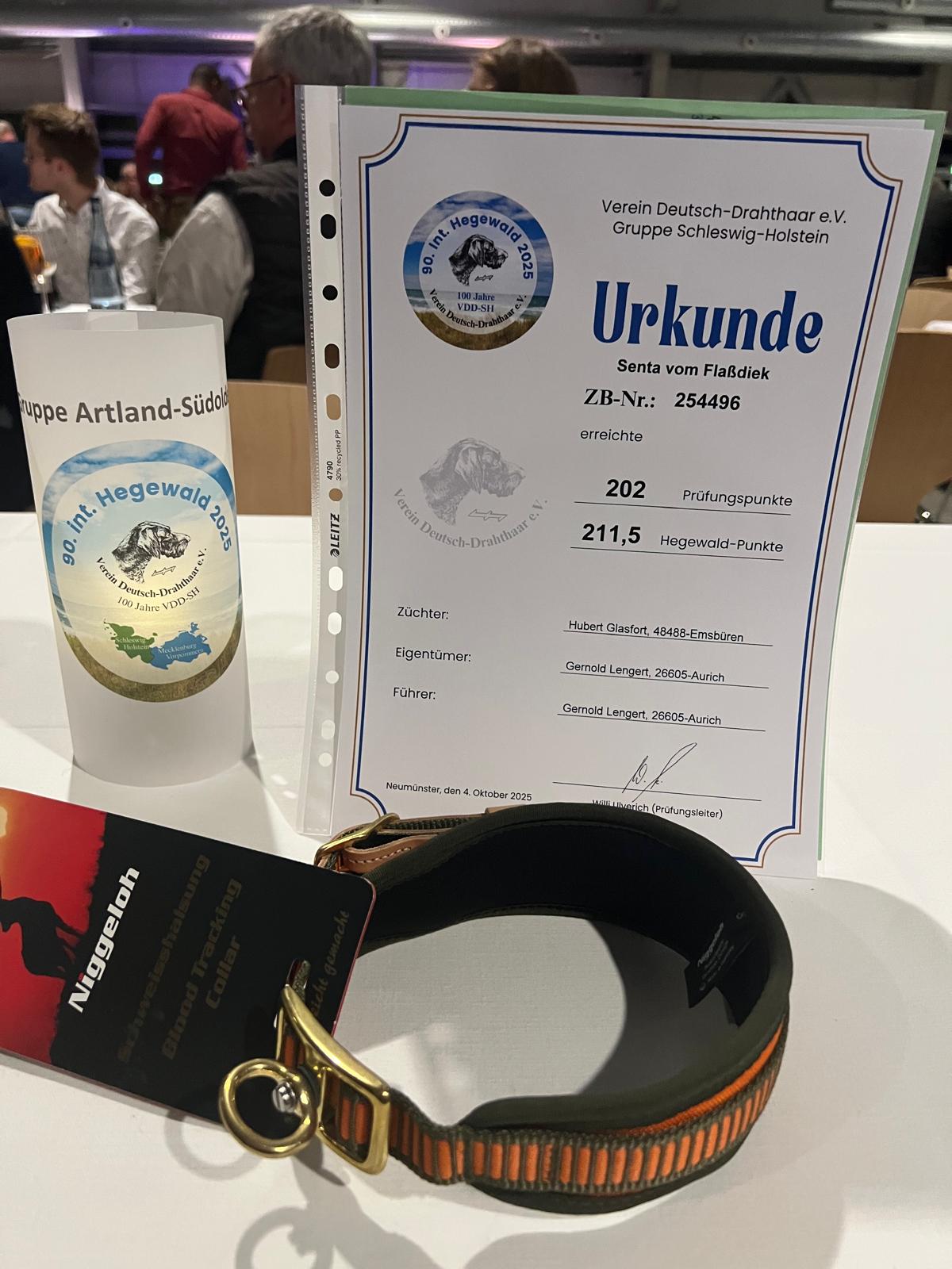 Am zweiten Tag der Hegewald lief es besser für Senta vom Flaßdiek mit Ihrem Füher Gernold Lengert. Insgesamt konnten 211,5 Hegewaldpunkte erreicht werden. Senta hat bei der Form und Haar Bewertung mit einem sehr guten Ergebnis abgeschnitten und erreichte in der Form ein SG mit 9 Punkten und im Haar ein SG mit 10 Punkten. Bei 198 gemeldeten und 187 erschienen Hunden konnte mit siebenmal 10 Punkten und dreimal 11 Punkten ein sehr guter Mittelplatz (119) errungen werden. Die Gruppe Ostfriesland-Nordoldenburg gratuliert dem Gespann und wünscht für die Zukunft alles Gute.